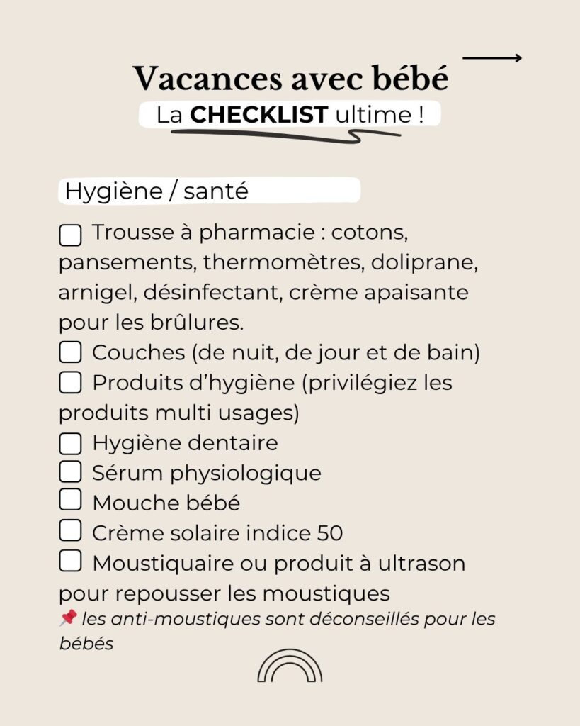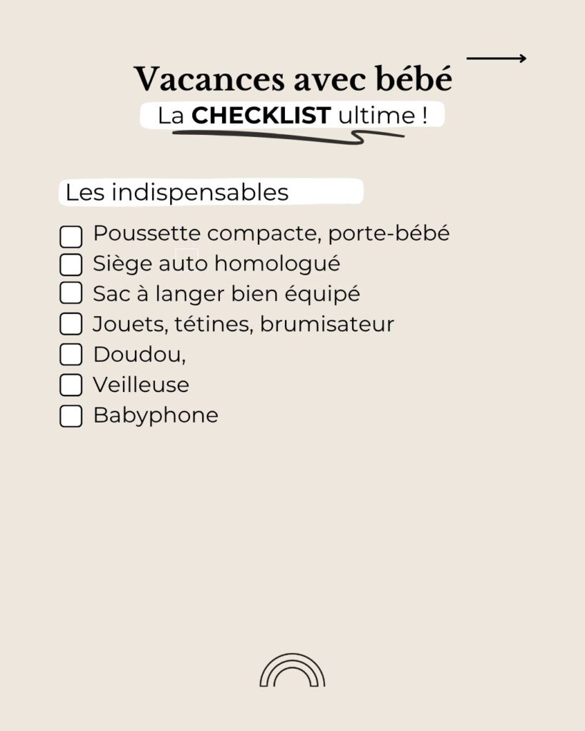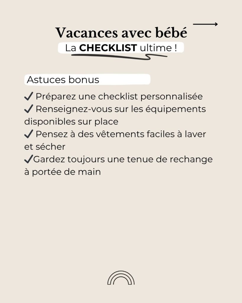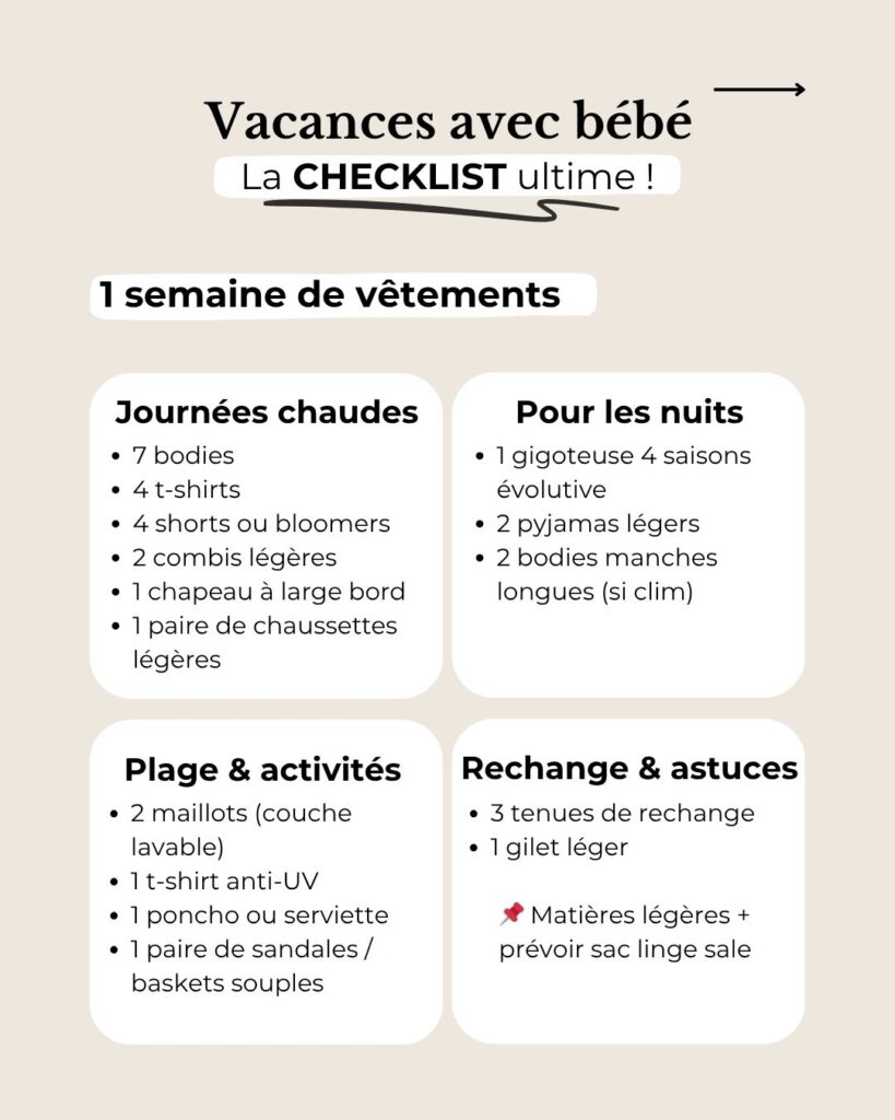 Vous voilà prêts à partir l’esprit léger avec bébé ! Que ce soit pour une escapade en bord de mer, une aventure en montagne ou un city-trip, votre petit trésor a tout ce qu’il lui faut pour profiter des vacances… et vous aussi. Grâce à cette check-list, fini le stress des oublis de dernière minute. Vous avez tout prévu : ses vêtements, ses produits de soin, ses repas et même ses petits jeux pour l’occuper. Un bébé heureux, c’est des parents sereins.